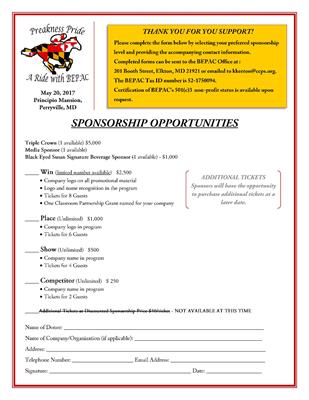 Sponsorship opportunities for this event are available.  For information on Sponsorships available, go to the BEPAC website:  http://cecil.schoolwires.net/domain/23.