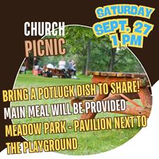 We'll be hosting our Church Picnic on Saturday, September 27 at Meadow Park. We'll be at the pavilion right next to the playground.