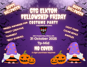 GTG Elkton Chapter & Spartan Cigar Lounge invite you to our inaugural Fellowship Friday. We will do this fellowship every last Friday of the month. This fellowship will be Halloween themed, so dig out your best costumes and join us for a little bit of debauchery, some shenanigans, & plenty of tomfoolery. There is no cover, just a 2 cigar minimum!