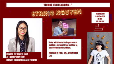“Florida Tech Presents:” will be hosting a free Facebook Live Webinar featuring String Nguyen, 4xLinkedIn’s Top Voice and the founder of The Trusted Voice. She will talk about the importance of building a personal brand and how to successfully utilize LinkedIn.